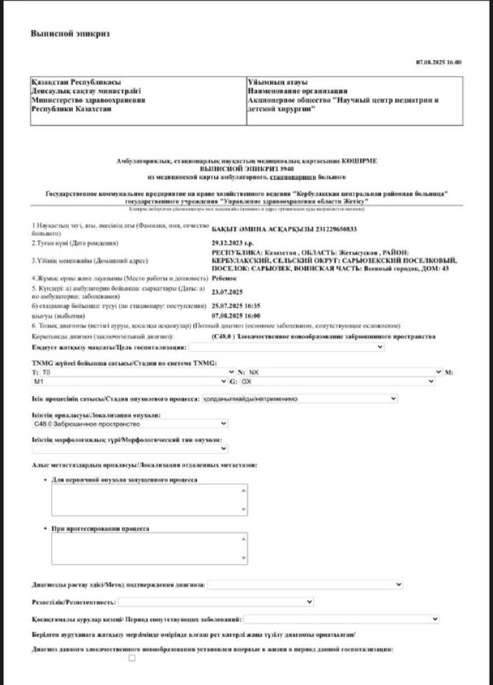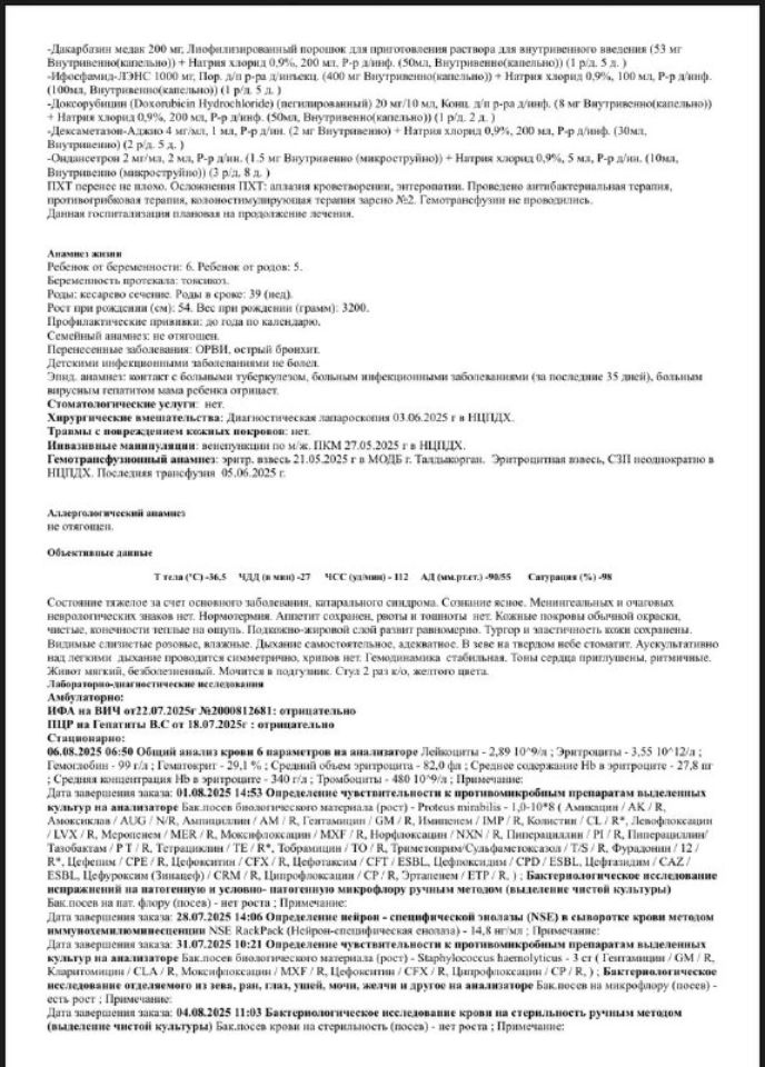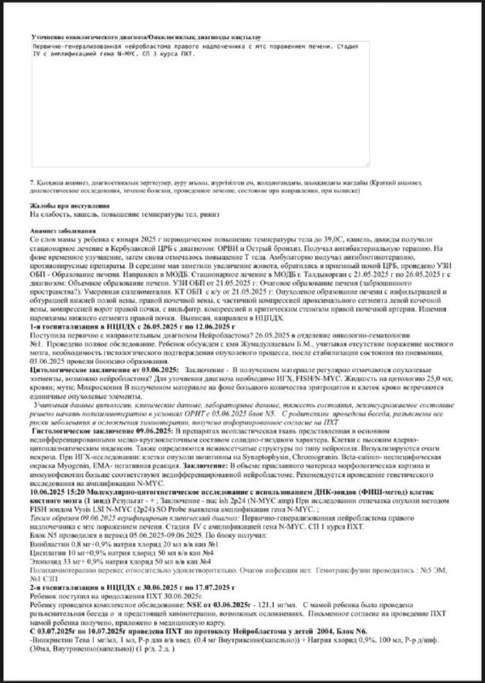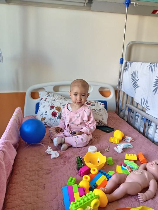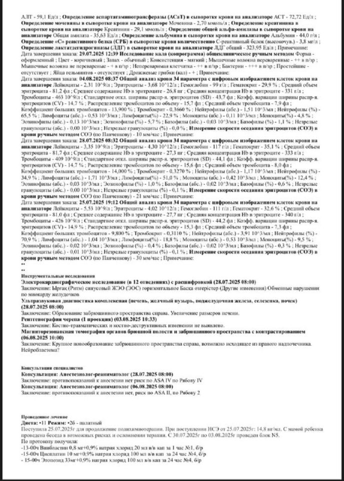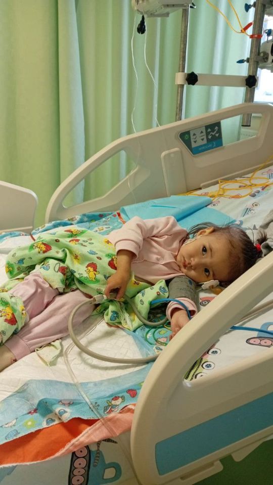 Через некоторое время у неё вздулся живот 😥. Мы сделали УЗИ 🩻, и выяснилось, что печень увеличена. После этого её положили в реанимацию 🏥, где она провела неделю. Дочка была сильно отёкшая 😔. Затем нас перевели в онкологию в Алматы, чтобы определить точный диагноз.
